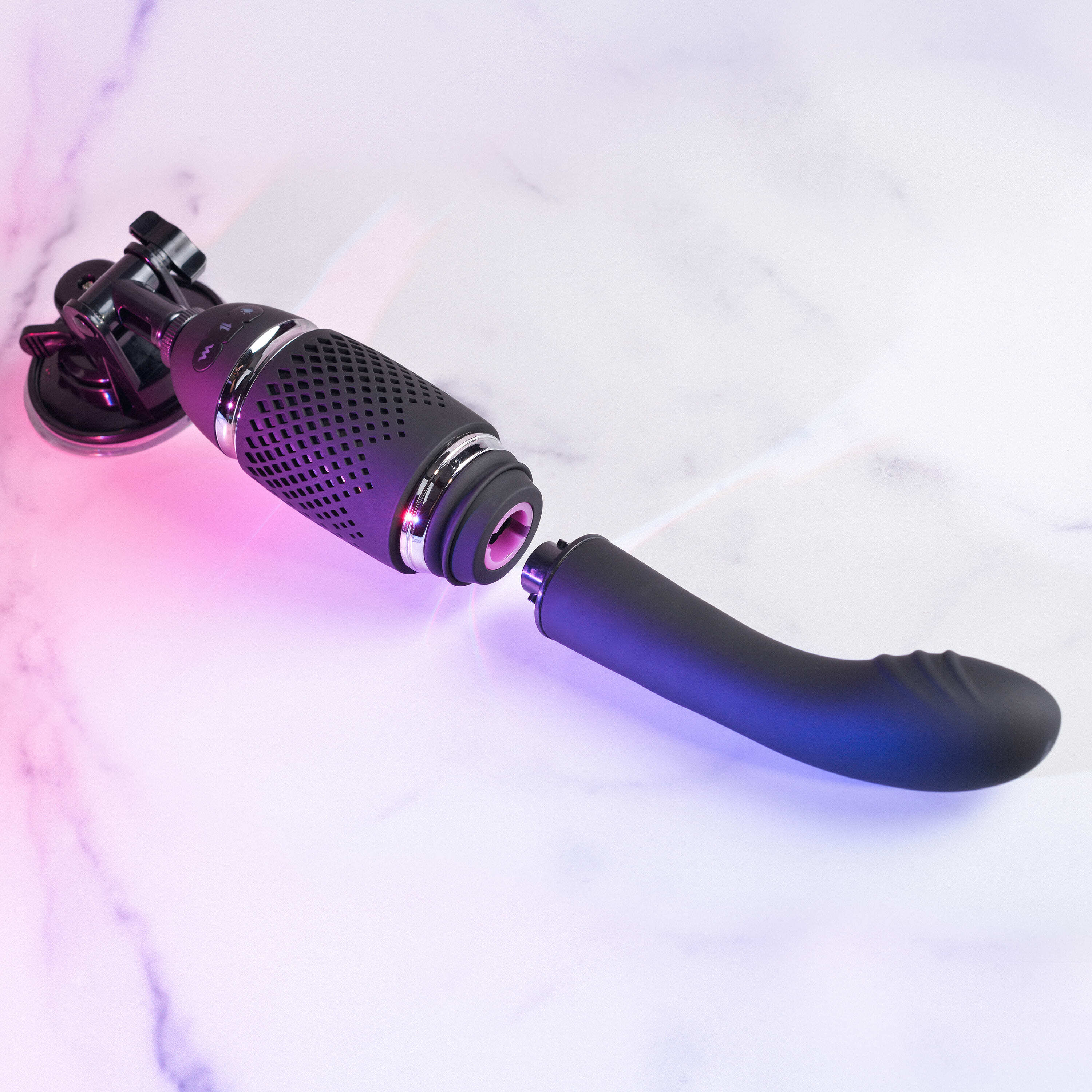 Incluye una base con la que podrás colocarlo en superficies planas y evitar que se mueva, dejando las manos completamente libres mientras disfrutas y la máquina hace todo el trabajo. También puedes retirar la base y auto-estimularte en la habitación e intercambiar los dildos fácilmente para alcanzar orgasmos increíbles.